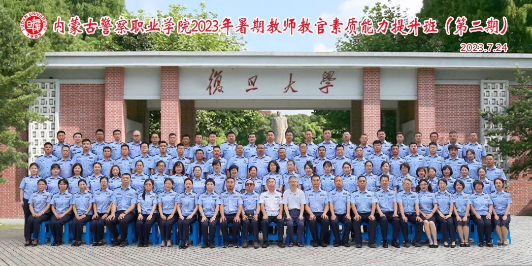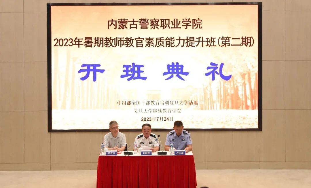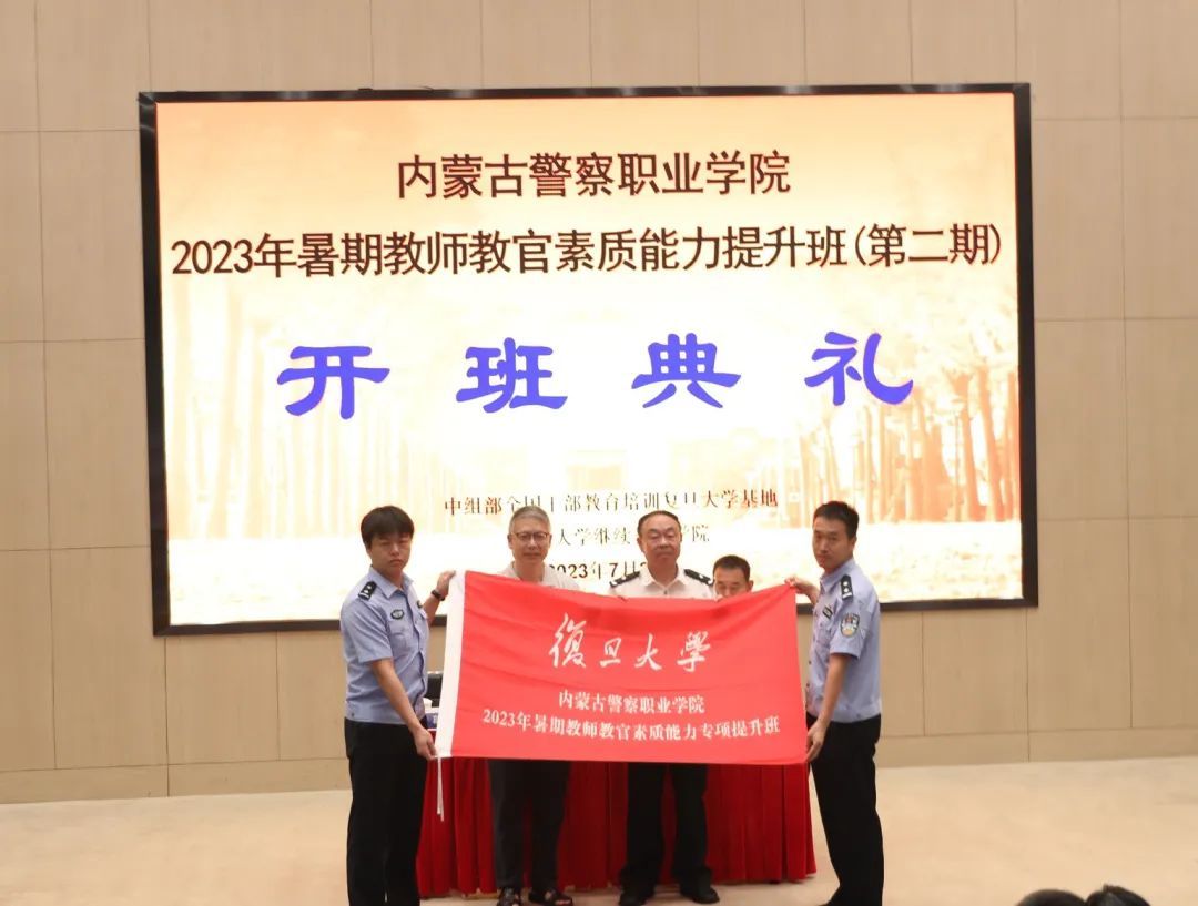 为深入推进学习贯彻习近平新时代中国特色社会主义思想主题教育,进一步落实公安厅党委“抓党建、强素质、整作风、树形象”专项行动部署要求,全面提升教师教官队伍素质,强化内蒙古公安教育训练质量,根据内蒙古公安厅统一安排,7月24日上午,内蒙古警察职业学院百名教师教官能力提升培训班(第二期)在复旦大学邯郸校区正式开班。复旦大学继续教育学院副院长葛宏波出席仪式并致欢迎辞,内蒙古警察职业学院图书馆馆长刘颖智作动员讲话,与会领导向培训班授予班旗。培训班临时党支部书记、学院教务处副处长卢向龙主持开班仪式。近百名参训学员参加仪式。