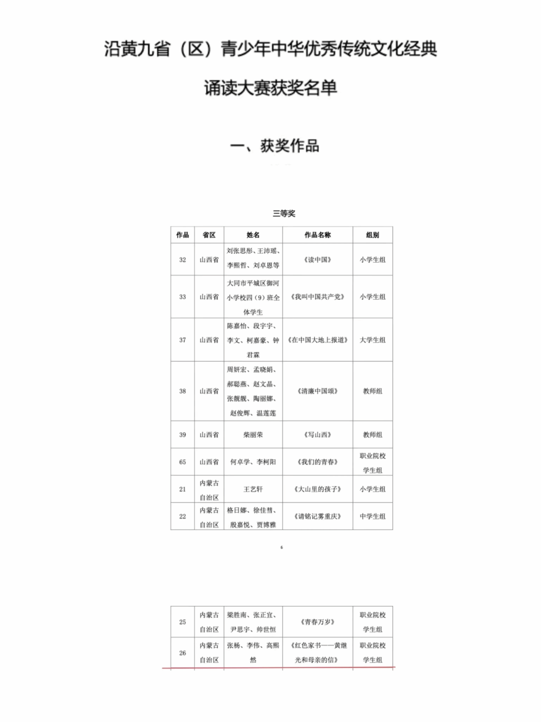 2023年6月,张杨、李伟、高熙然同学朗诵作品《红色家书——黄继光和母亲的信》获得沿黄九省(区)青少年中华优秀传统文化经典诵读大赛三等奖。