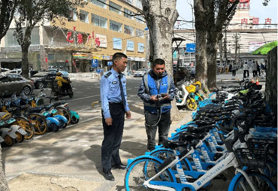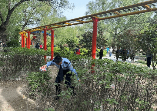 在呼和浩特市青城公园开展志愿服务活动,清扫园区垃圾,铲除小广告,摆放好共享单车。