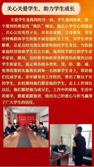 为深入学习贯彻党的二十大精神,大力培养选树新时代高校辅导员先进榜样,自治区教育厅组织了2022年全区“最美高校辅导员”推选展示活动。经过资格审查、专家评审和网络答辩,评选出10名2022年内蒙古自治区“最美高校辅导员”,其中,我院学生处一大队副队长、辅导员陈闯获此殊荣。