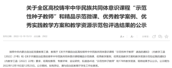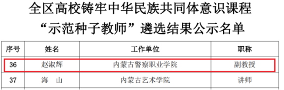 内蒙古自治区教育厅近期公布《关于全区高校铸牢中华民族共同体意识课程“示范性种子教师”和精品示范微课、优秀教学案例、优秀实践教学方案和教学资源示范包评选结果的公示》,我院政治理论教学部副主任赵淑辉被评为全区高校铸牢中华民族共同体意识课程“示范性种子教师”。