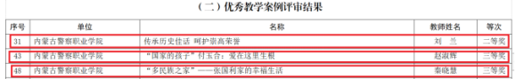 我院政治理论教学部四名教师提交自治区高校铸牢中华民族共同体意识课精品示范课程、优秀教学案例、优秀实践教学方案、教学资源包等相关7个项目参加评比,6个项目斩获佳绩,其中政治理论教学部副主任赵淑辉荣获两项三等奖,政治理论教学部教师朱广芹博士荣获三等奖,政治理论教学部教师刘兰荣获两项二等奖,政治理论教学部教师秦晓慧获三等奖。