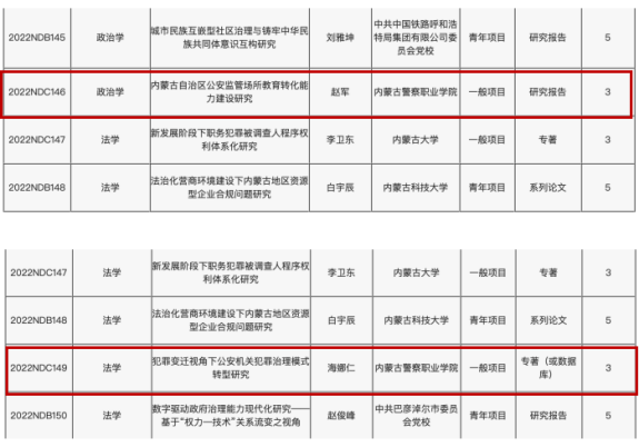 日前,在2022年度内蒙古自治区哲学社会科学规划项目立项评审中,我院取得重大突破,共有监管系赵军副教授主持的《内蒙古自治区公安监管场所教育转化能力建设研究》、蒙语授课教学部海娜仁副教授主持的《犯罪变迁视角下公安机关犯罪治理模式转型研究》、政治理论教学部朱广芹博士主持的《重大公共危机事件下边疆社区安全韧性治理研究》和侦查系罗威丽博士主持的《内蒙古电信网络诈骗治理路径研究》等4个项目获批。自治区哲学社会科学规划项目是自治区哲学社会科学领域最高科研项目,申请人数众多、评审严格规范。