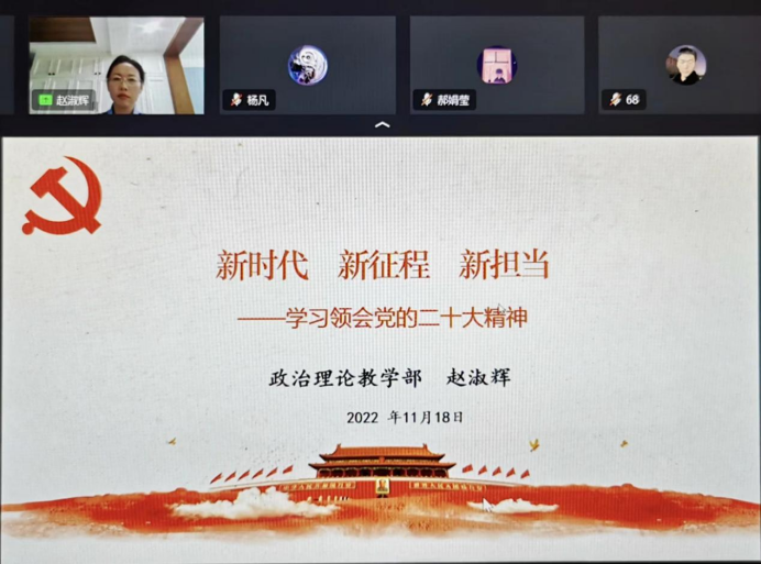 11月18日,政治理论教学部副主任赵淑辉以“新时代 新征程 新担当”为题,从深刻领会党的二十大的重大意义、党的二十大主题的丰富内涵、过去5年的工作和新时代10年的伟大变革、开辟马克思主义中国化时代化新境界、以中国式现代化推进中华民族伟大复兴的使命任务、坚持党的全面领导和全面从严治党的部署要求等,带领学生深入学习领会党的二十大精神,并向全体学生发出倡议,大家要迅速将思想和行动统一到党的二十大精神上来,坚定不移听党话、跟党走,立志做有理想、敢担当、能吃苦、肯奋斗的新时代好青年,不负青春、不负时代,不负党和人民的期望,让青春在全面建设社会主义现代化国家的火热实践中绽放绚丽之花。