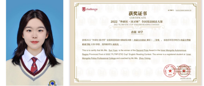 11月5-6日,由外研社、北京外研在线数字科技有限公司和中国外语测评中心主办,中国外语与教育研究中心合办的2022“外研社•国才杯”全国英语演讲、写作、阅读大赛内蒙古赛区决赛隆重举行。我院经过精心选拔,共派出两名选手参加了11月6日举办的阅读大赛,与区内20余所院校、51名选手同台竞争。周奕名老师指导的2022级治安管理一区队孙源同学荣获阅读大赛二等奖,谭昆老师指导的2022级治安管理二区队李美萱同学荣获阅读大赛三等奖。