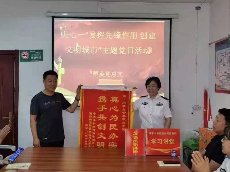 为表达对学院包联工作的感谢和认可,群英社区向包括警院在内的四个包联单位赠送了“真心为民办实事 携手共创文明城”锦旗。公安管理系党支部副书记、主任石丽荣代表学院领受了锦旗。石丽荣表示作为警院人,立足实际为社区群众办实事,我们义不容辞,责无旁贷,要一如既往地支持群英社区工作,自觉承担起共产党员的政治责任和合格公民的社会责任,与社区共谋“警”“群”联创共建新模式,助力首府全国文明城市创建。