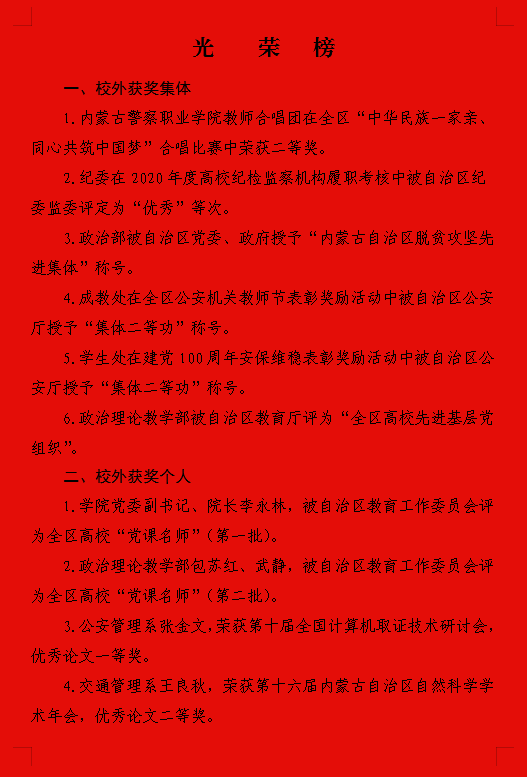 为表彰先进,树立榜样,激励斗志,增强广大教师的责任感、荣誉感和使命感,2021年9月9日下午学院隆重举行庆祝第37个教师节暨表彰大会系列活动。自治区公安厅政治部党委副书记、副主任潘存和,公安厅政治部人事训练处处长邓忠及学院党委班子成员出席会议,党委副书记、院长李永林主持会议,全体教职工、部分退休教师和学生代表参加会议。