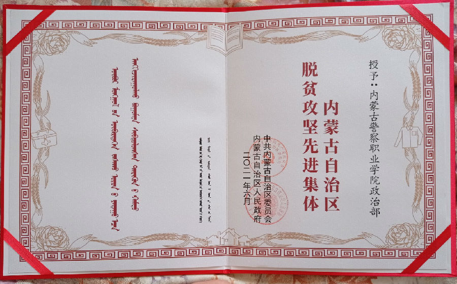 2021年6月22日,全区脱贫攻坚总结表彰大会在呼和浩特市隆重召开。会上,自治区党委、自治区人民政府授予张海军等595名同志“全区脱贫攻坚先进个人”称号,授予呼和浩特市新城区保合少镇人民政府等400个集体“全区脱贫攻坚先进集体”称号,以表彰其为内蒙古打赢脱贫攻坚战发挥的重要作用和作出的积极贡献。此次表彰中,学院政治部被授予“全区脱贫攻坚先进集体”称号,是自治区直属机关工委推荐的16个先进集体和自治区教育系统13个受表彰集体之一。