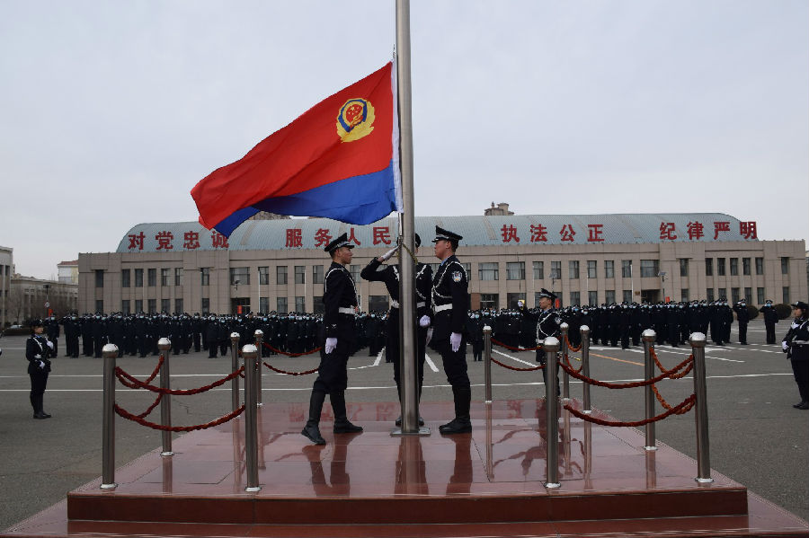 旗帜引领方向,旗帜凝聚力量。庄严的警旗迎风飘扬,银色的警徽在冬日朝阳的照射下熠熠生辉。护旗手昂首挺胸、精神抖擞,迈着整齐坚定的步伐护卫警旗入场。伴随着激昂的警歌,警旗冉冉升起,全体人员着装整齐,列队肃立,面向警旗庄严敬礼,表达了对党和祖国的无限忠诚,对中国人民警察队伍的无限热爱。