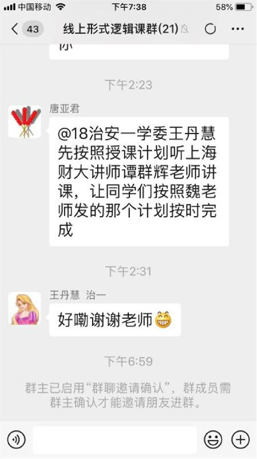 直播课课堂气氛活跃,教师注重与学生的互动,采用群内语音或文字讨论、语音通话等方式与学生互动,还要求学生在认真听的同时做好笔记。同学们积极参与,认真回答问题。直播课过程中,学院领导及教务处督导科教师及时跟进听课,检查网上授课情况并及时反馈。课程结束后,授课教师及时与学生交流,学生们也积极畅谈感受。慕课学习群里,代课教师认真引导学生按照计划听课、做笔记、网上答题。总体来看,网课互动多,课堂气氛活跃,网络顺畅,学院首日网课进展情况良好。