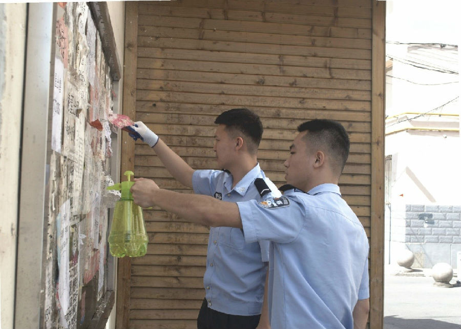 阳光正好,我院积极分子为山丹小区40个单元铲除“牛皮癣”。男女分工分组,有的喷水、润湿小广告;有的用铲子将其铲除;有的负责用涂料进行遮盖;有的负责清理地面。一上午有条不紊的将山丹小区的“颜值”从“丑女”变身为“白富美”,使得居民楼道焕然一新。