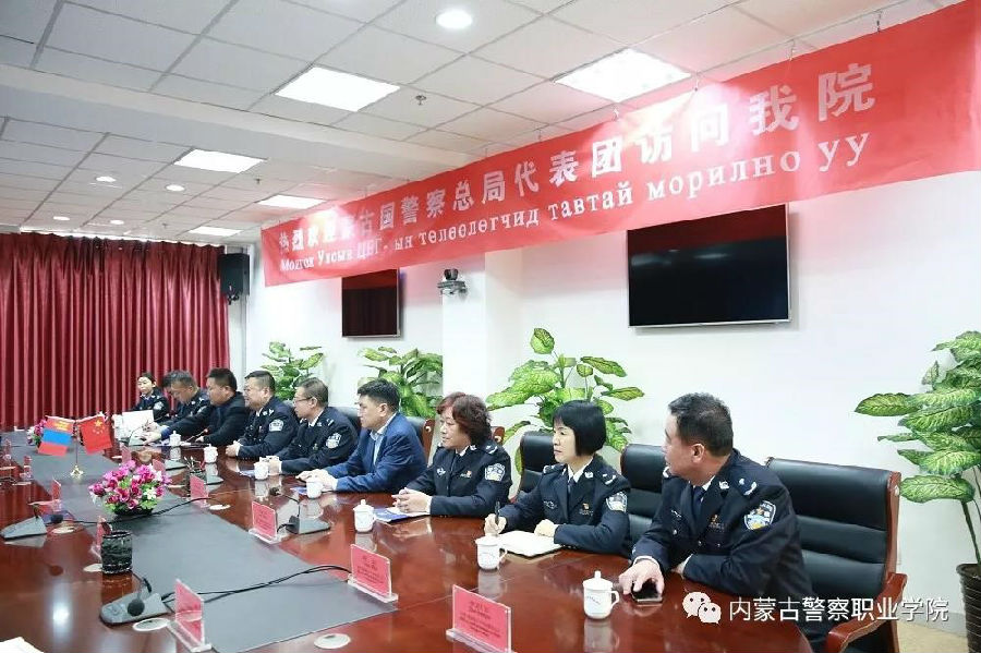 2018年11月27日上午,以蒙古国警察总局副局长、首都警察局局长达·亚达木道尔吉上校为团长的蒙古国警察总局代表团一行7人莅临内蒙古警察职业学院访问交流。内蒙古公安厅国际警务合作局局长朱晓旭等陪同访问。内蒙古警察职业学院党委书记、院长赵永刚及在家党委成员与代表团亲切座谈。