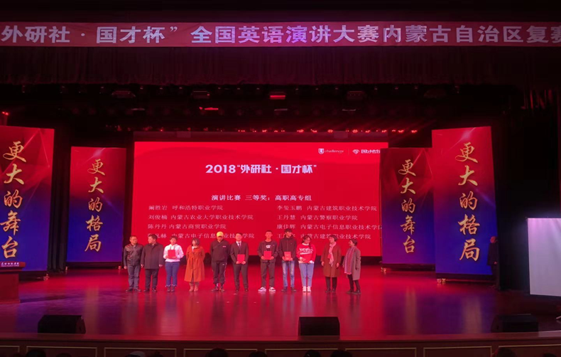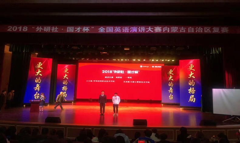 2018“外研社·国才杯”全国英语演讲大赛是由外语教学与研究出版社主办、教育部高等学校大学外语教学指导委员会合办的全国性英语演讲赛事。在2017年2月被纳入中国高校创新人才培养暨学科竞赛评估项目,为国内最具广泛影响力的竞赛项目之一。这是我院师生继10月21日第九届全国高职高专英语写作大赛内蒙古复赛之后取得的另一佳绩,再次为学院争光。