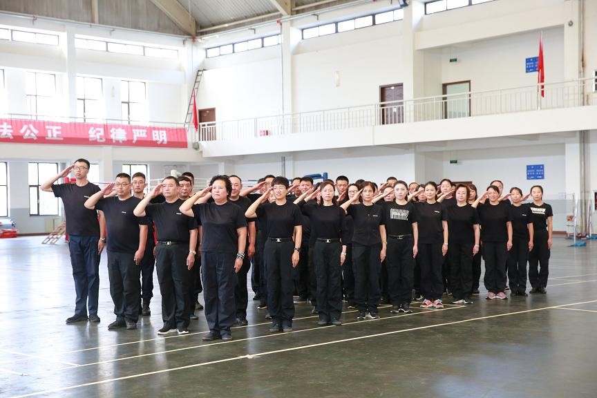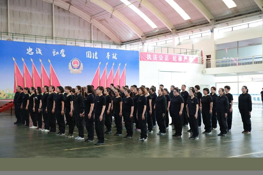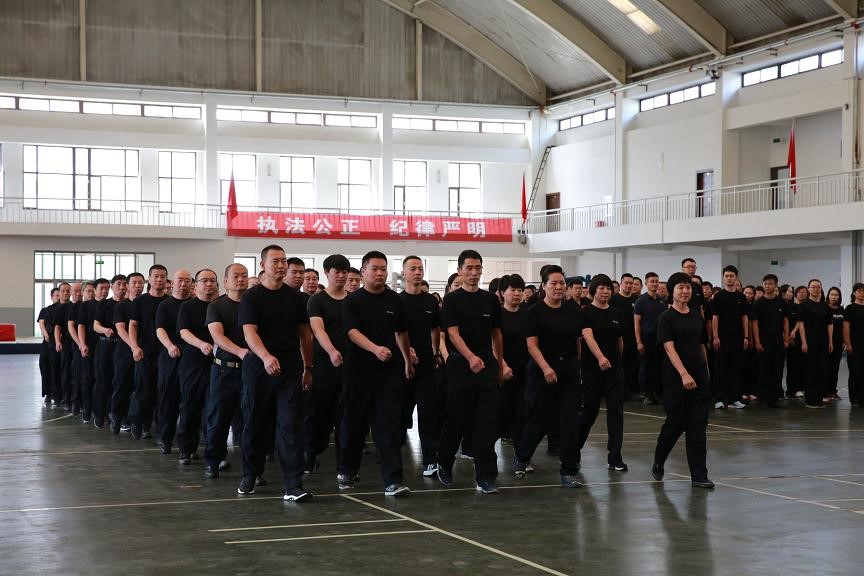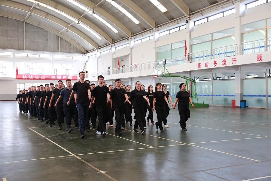 “稍息、立正”“向右转、向左转、向后转”“齐步走”“敬礼”“一、二、三、四”……动作规范,整齐划一。在平阔的警体馆,全体民警昂首挺胸、列队开步,雄浑的口号铿锵有力,劲健的步伐掷地有声。升国旗演练环节,全过程、全方位反映出民警们警容严整、训练有素、服从命令、听从指挥、动静分明、节奏统一的良好精神风貌。