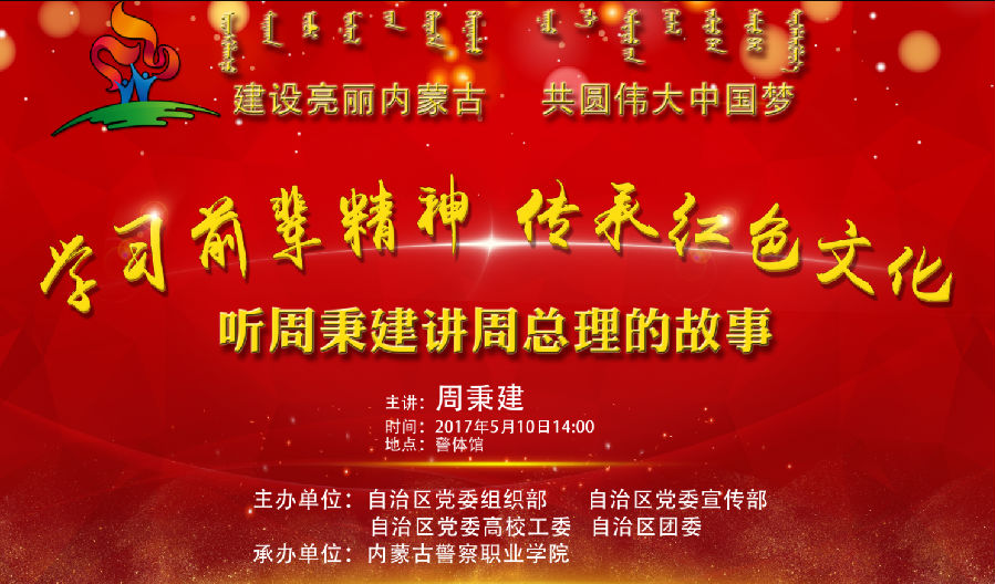 为贯彻落实内蒙古自治区党委办公厅、自治区人民政府办公厅《关于推进高等院校形势政策报告会制度化常态化意见》精神,按照《2017年全区高校百场形势政策报告会工作方案》要求,5月10日下午,我院第二场形势政策报告会“建设亮丽内蒙古·共圆伟大中国梦”在警体馆举办。报告会邀请财政部离退休干部局巡视员、第十一届、十二届全国政协委员、周恩来总理的侄女周秉建做了“学习前辈精神,传承红色文化——听周秉建讲周总理的故事”专场报告。学院党委书记、院长舒雅同志主持报告会并做总结发言,在家的党委班子成员及全体师生员工现场聆听了报告。