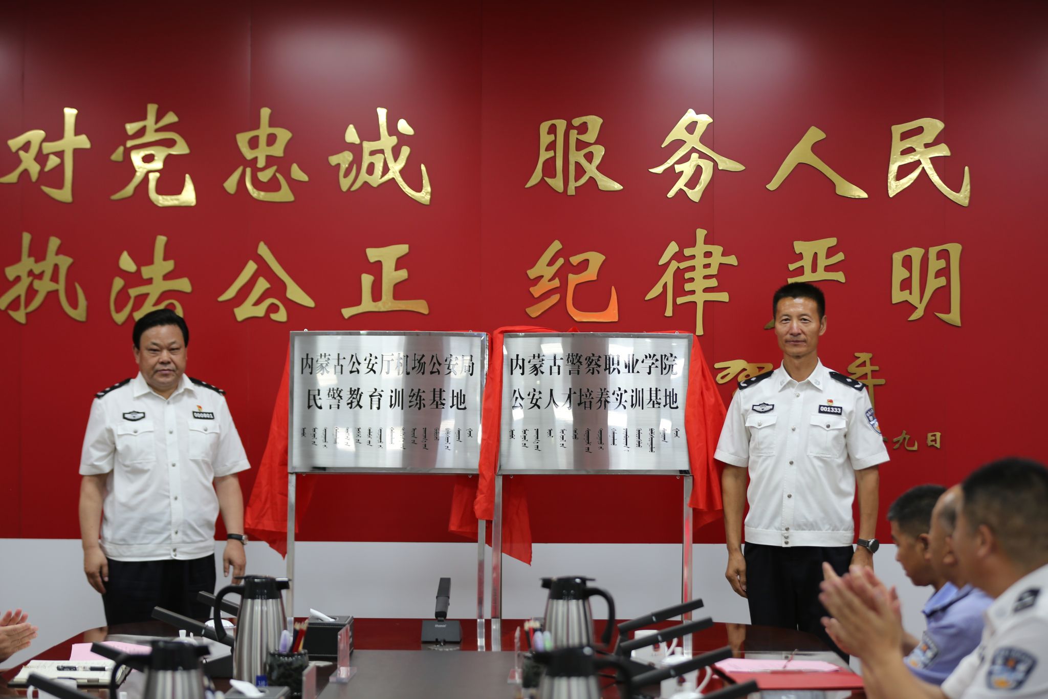 在与会人员的共同见证下,李永林院长和邓江政委代表双方签署了《合作共建协议》,苏和生书记和赵景华局长共同为“内蒙古警察职业学院公安人才培养实训基地”“公安厅机场公安局民警教育训练基地”揭牌。