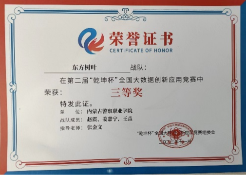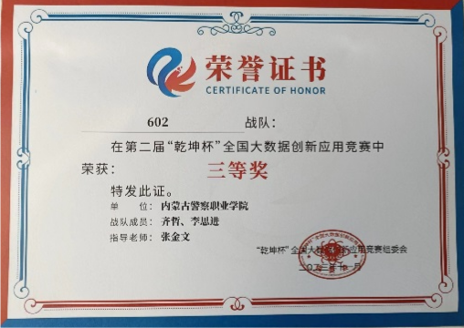 在本届“乾坤杯”全国大数据创新应用竞赛中,获得一等奖的学生是2022级侦查专业的李毅、治安专业的汪泽群、特警专业的李文轩;获得二等奖的学生是2023级网安专业的王婧、马帅,侦查专业的王政;获得三等奖的学生是2022级网安专业的王垚、姜嘉宁、赵震、李思进、齐哲,2023级网安专业的贾明远、刘渊、李蒙蒙。在本届“智器云杯”数据情报分析大赛中,获得三等奖的学生是2022级侦查专业李毅、网安专业陈静、董凌瑀。以上两个大赛的指导教师均为学院公安管理系网安专业张金文老师。