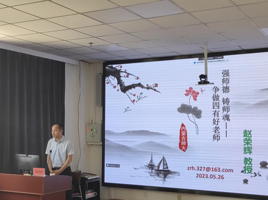 赵荣辉教授以《强师德 铸师魂——争做四有好老师》为题,从师德的意蕴、教师应当具备的师德修养、师德形成的实践路径等方面内容展开,结合真实鲜活的案例进行生动阐述,并希望老师们能够建立好自己的成长档案,做学生的引路人。