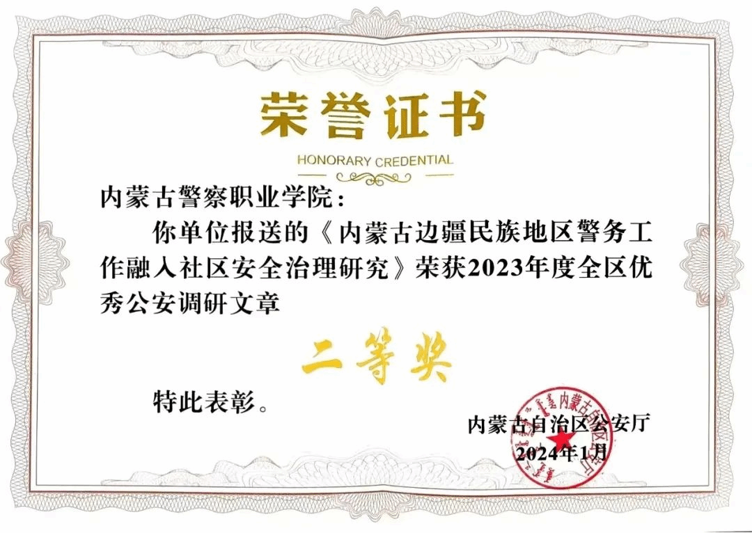 近期,内蒙古自治区公安厅公布2023年度全区公安调研工作优秀调研成果名单,通报表彰优秀调研成果18篇,我院政治理论教学部朱广芹教授的《内蒙古边疆民族地区警务工作融入社区安全治理研究》荣获优秀调研成果二等奖,法律系杨宇烨教授的《以法治公安建设筑牢祖国北疆安全稳定屏障》荣获优秀调研成果三等奖。