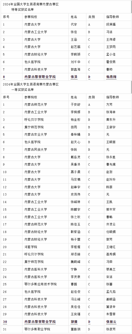 内蒙古赛区特、一等奖名单