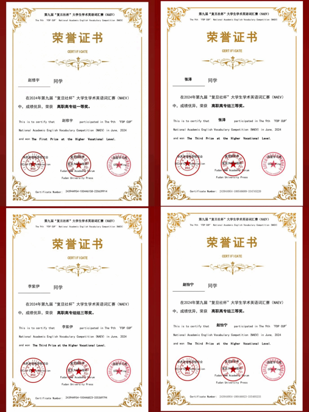 本次大赛,以“AI时代大学生学术英语学习与发展”为主题,面向全国具有高等学历教育招生资格的普通高等学校在校本科生与研究生、高职高专学生,来自北京大学、复旦大学、南开大学、南京大学、厦门大学等全国多个院校的7.7万名选手参与线上角逐。大赛从2024年4月30日正式启动报名,历经初赛、复赛和决赛,我院学生凭借扎实的英语功底和过硬的心理素质,在众多比赛选手中努力拼搏、奋勇争先、脱颖而出,1名同学获得一等奖,3名同学获得三等奖,8名同学获得优胜奖,公安管理系英语教研室教师周奕名获得“优秀指导老师”称号。