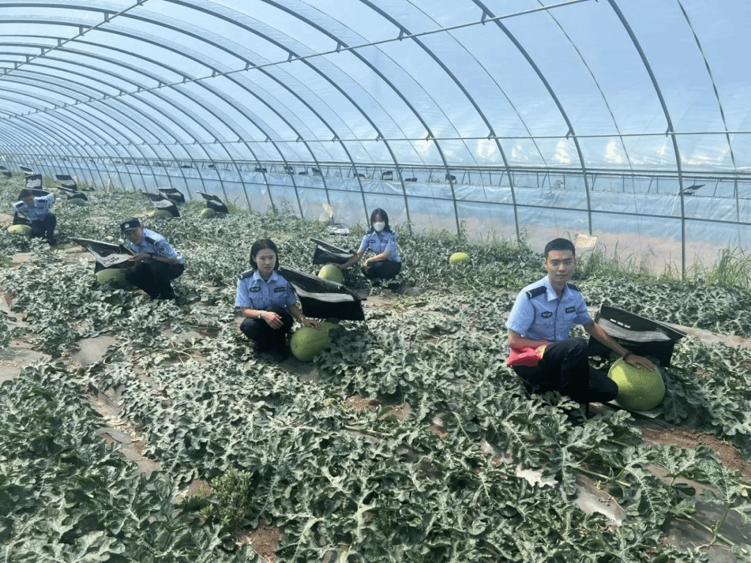 随后,实践团成员又来到科尔沁右翼前旗绿邦农业特色种植产业园区,他们在工作人员的讲解下了解了“瓜王”培育的过程与种植此类西瓜所需要的条件,在瓜田中为未成熟的瓜搭上“凉伞”,避免高温暴晒。通过访谈交流,同学们对该村的特色种植工作有了进一步的了解。特色种植产业不仅提高了村民的经济水平,也为乡村文化振兴奠定了坚实基础。