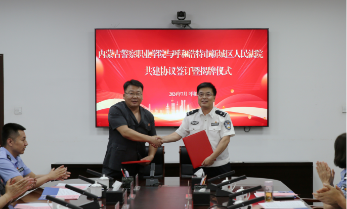 为认真贯彻落实中办、国办印发《关于加强新时代法学教育和法学理论研究的意见》精神,进一步深化“协同育人”合作机制,加强学院与法院之间的交流合作,推动法学教育与司法实践共同发展,7月16日下午,内蒙古警察职业学院与呼和浩特市新城区人民法院共建协议签订暨揭牌仪式在学院隆重举行。