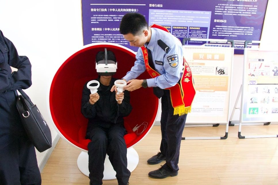 在吸毒危害警戒室中,志愿者利用禁毒教育VR设备,让新同学“沉浸式”体验吸毒危害,并教育同学们要提高禁毒意识、警惕毒品陷阱、抵制毒品诱惑,培养正确的世界观、人生观、价值观。