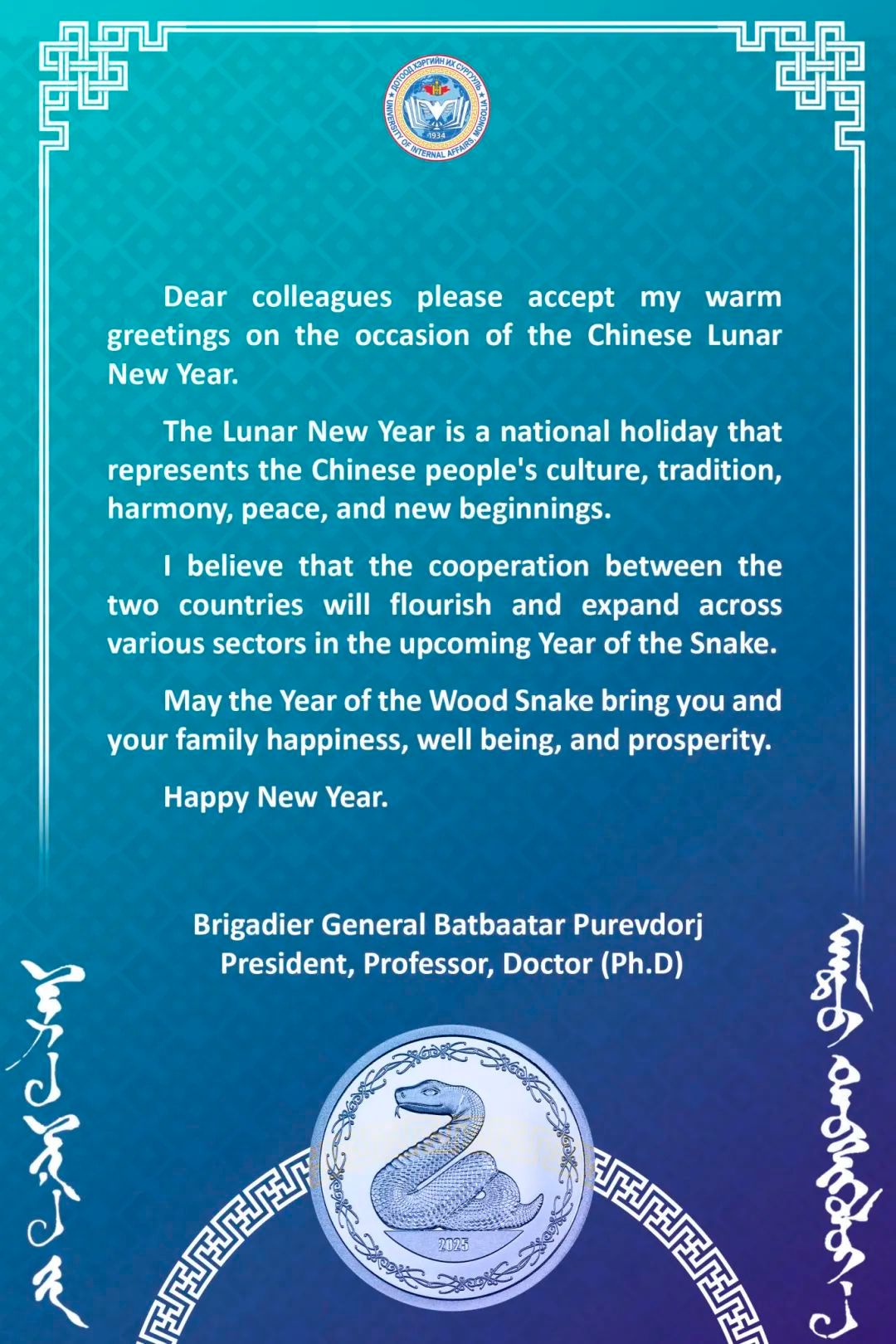 希望蛇年能够给贵校全体人员及家人带来幸福、安康和繁荣。