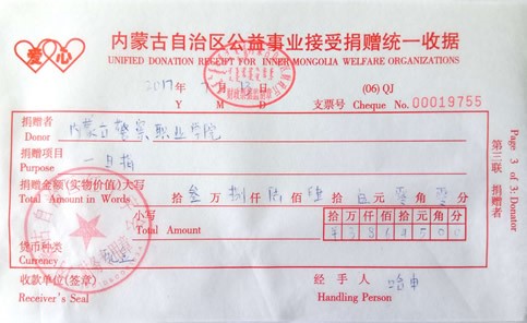 2017年7月13日上午,内蒙古自治区红十字会巴·哈申吉如和包晶兰两位同志应邀来我院政治部接收善款,共计38645元,并开具了内蒙古自治区公益事业接受捐赠统一收据。