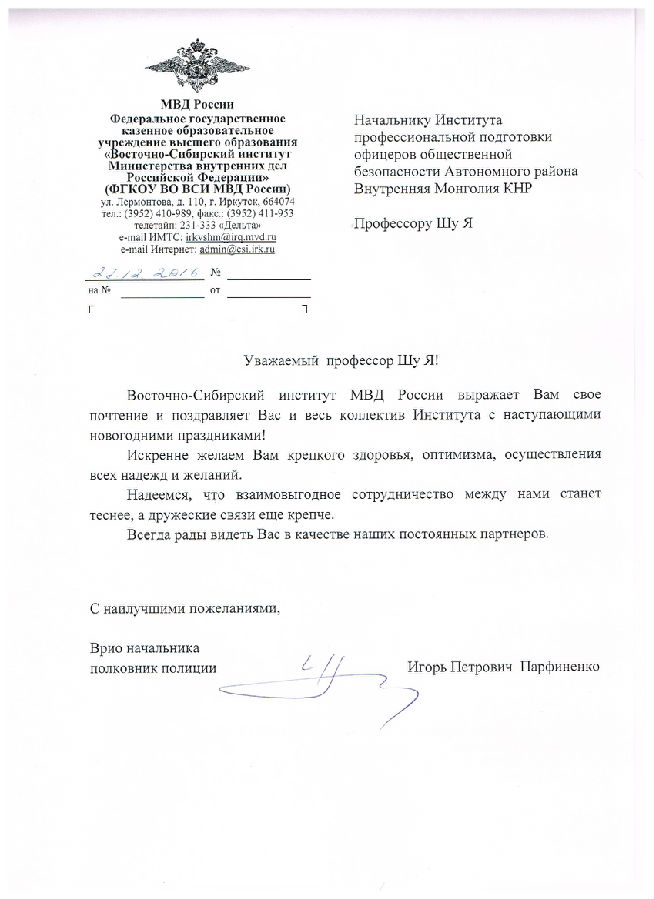 俄罗斯联邦内务部东西伯利亚学院向您表达最诚挚的祝福,祝您及全体教职工新年快乐,衷心祝您身体健康,心情愉快,万事如意。愿我们的合作更上一层楼,友谊地久天长,愿我们成为长期友好的合作伙伴。