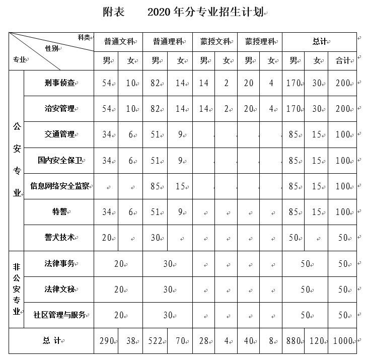 ●2020年计划招生1000人,公安专业850人,非公安专业150人,公安专业女生不超过招生计划的15%。