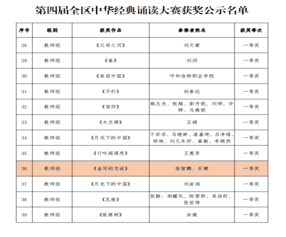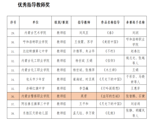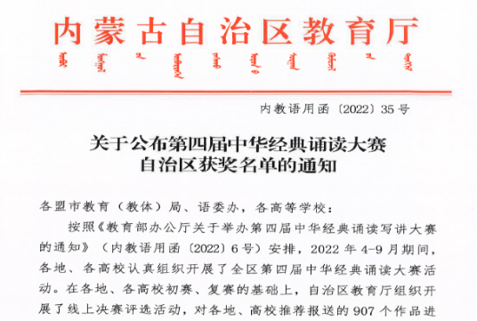 12月26日,由教育部、国家语委办主办的“第四届中华经典诵写讲大赛”内蒙古自治区赛区获奖名单公布。我院选送的由英君老师指导,张智鹏、石健老师朗诵的作品《血写的忠诚》在全区各盟市、高等学校参赛的907个作品中脱颖而出,荣获全区中华经典诵读大赛教师组一等奖,英君老师荣获优秀指导教师奖,内蒙古警察职业学院荣获优秀组织团体奖。