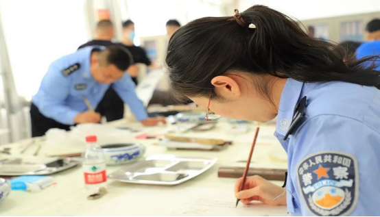 “随风潜入夜,润物细无声”、“博学多思”……书画家们现场挥毫泼墨,把对警营“园丁”的敬爱和关心之情倾注于笔端,用优秀的书画作品向他们致敬。