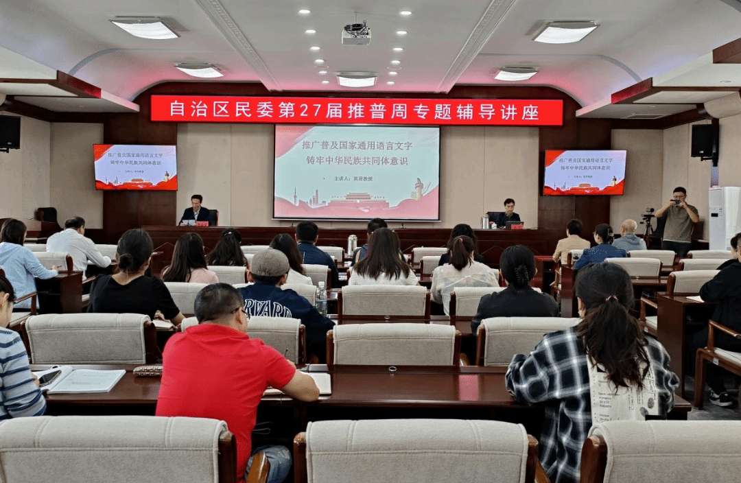 学院主动发挥国家和自治区语言文字两级基地的示范作用。9月11日,国家语委语言文字督导专家、自治区语言文字工作视导员,学院英君教授为自治区民委举办的全区铸牢中华民族共同体意识教育实践基地工作人员培训班和民委机关干部做了《推广普及国家通用语言文字,铸牢中华民族共同体意识》专题讲座。9月20日,内蒙古自治区政协成功举办庆祝中华人民共和国和人民政协成立75周年文艺汇演活动,英君教授诗朗诵《那是我的祖国》,展示了普通话语言艺术的魅力。