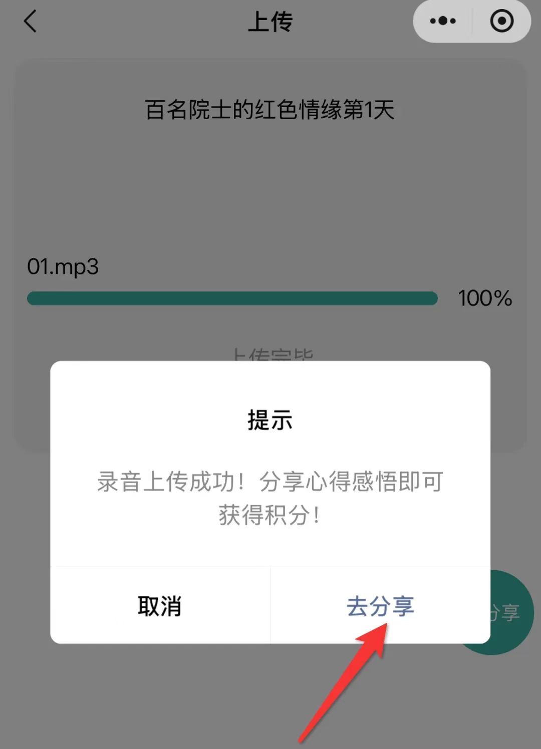 5. 写“心得感悟”(一定要在录音结束后,点击"去分享"才会获得积分)
