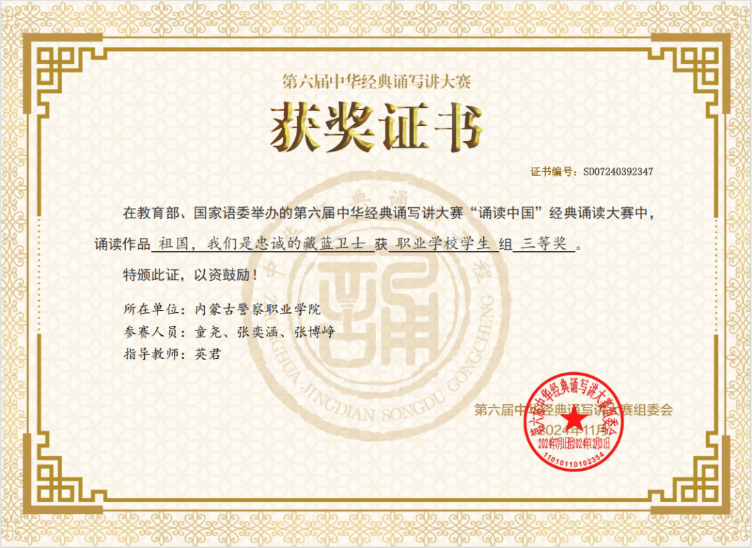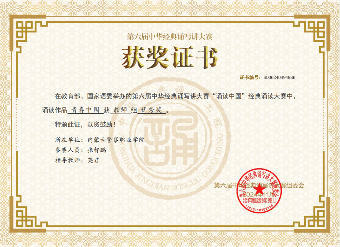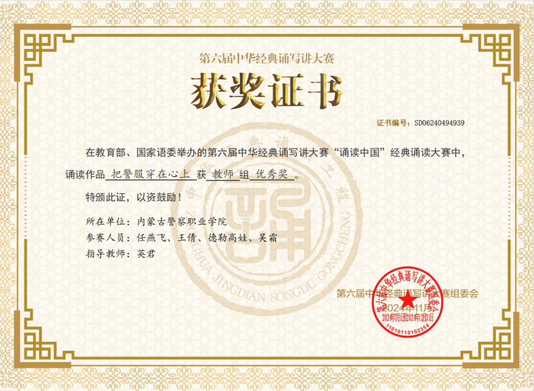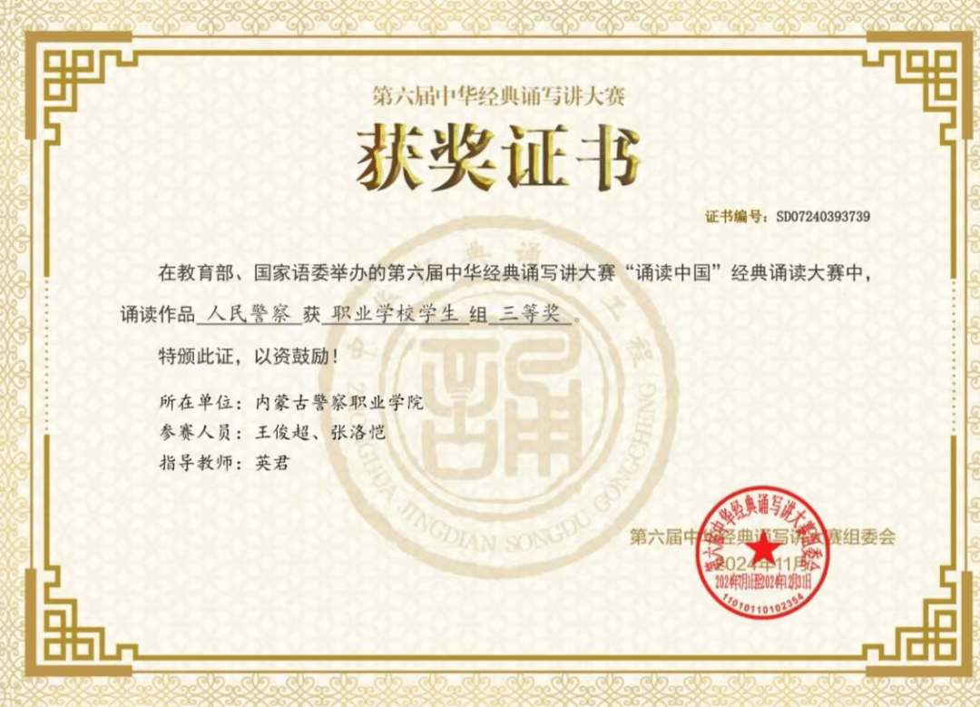 今年5月,根据《教育部办公厅关于举办第六届中华经典诵写讲大赛的通知》要求及自治区相关工作部署,学院积极举办以“典耀中华,赓续文脉”为主题的“藏蓝杯”中华经典诵读大赛,遴选优秀选手,积极备战区赛。最终,学院推送的作品在全区各盟市、高等学校参赛的906件作品中脱颖而出,2023级学生王俊超、张洛恺的作品《人民警察》、2023级学生童尧、张奕涵、张博峥的作品《祖国,我们是忠诚的藏蓝卫士》获全区诵读大赛职业院校学生组一等奖,张智鹏教师的作品《青春中国》获全区教师组一等奖;2022级学生刘一凡、李伟的作品《秋天里的中国》获全区诵读大赛职业学生组二等奖,任燕飞、王倩、德勒高娃、吴霜4位教师合诵的作品《把警服穿在心上》获全区教师组二等奖;内蒙古警察职业学院荣获优秀组织团体奖,公安管理系党总支书记邢宏博荣获优秀组织个人奖。其中4组作品入围全国复赛,并成功闯入全国决赛。(各省入围国赛复赛作品,职业学校学生组共计597件,教师组890件;其中,内蒙古赛区职业学校学生组19件,教师组33件。国赛决赛中,职业学校学生组获三等奖作品3件,其中我院2件;教师组获优秀奖作品11件,其中我院2件。)