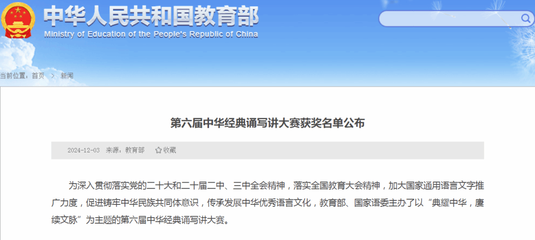 近日,由教育部、国家语委主办的以“典耀中华,赓续文脉”为主题的第六届中华经典诵写讲大赛“诵读中国”经典诵读大赛获奖名单公布。我院四组参赛作品中,两组荣获全国职业学校学生组三等奖,两组荣获教师组优秀奖,实现了以往在中华经典诵读大赛国赛中榜上无名的历史性突破,再次彰显了学院语言文字工作取得的显著成效。